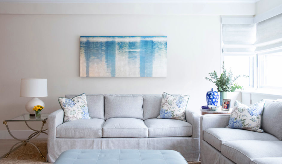 For a pair of new grandparents we designed a traditional, comfortable and bright place to welcome the family when visiting New York. We created a large comfortable seating area with two matching sofa's with a custom soft edged ottoman serving as a coffee table. The client's own antique Art Deco chairs provided the inspiration for the scheme. Bedrooms relied on fun prints and friendly palettes and while the design for the bathroom and kitchen opted for a fresh and clean aesthetic.