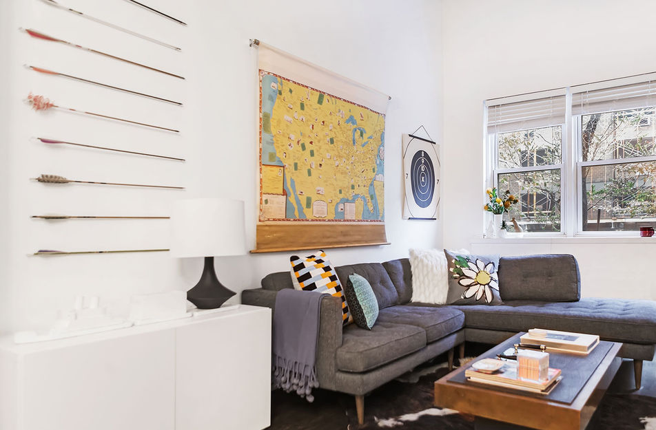 Geometric forms, modern folk art, and a mix of contemporary and vintage pieces create an eclectic and bold interior. Bright white, strong blues and mossy greens connect the rooms of this Manhattan apartment while black light fixtures, furniture and accents ground it.